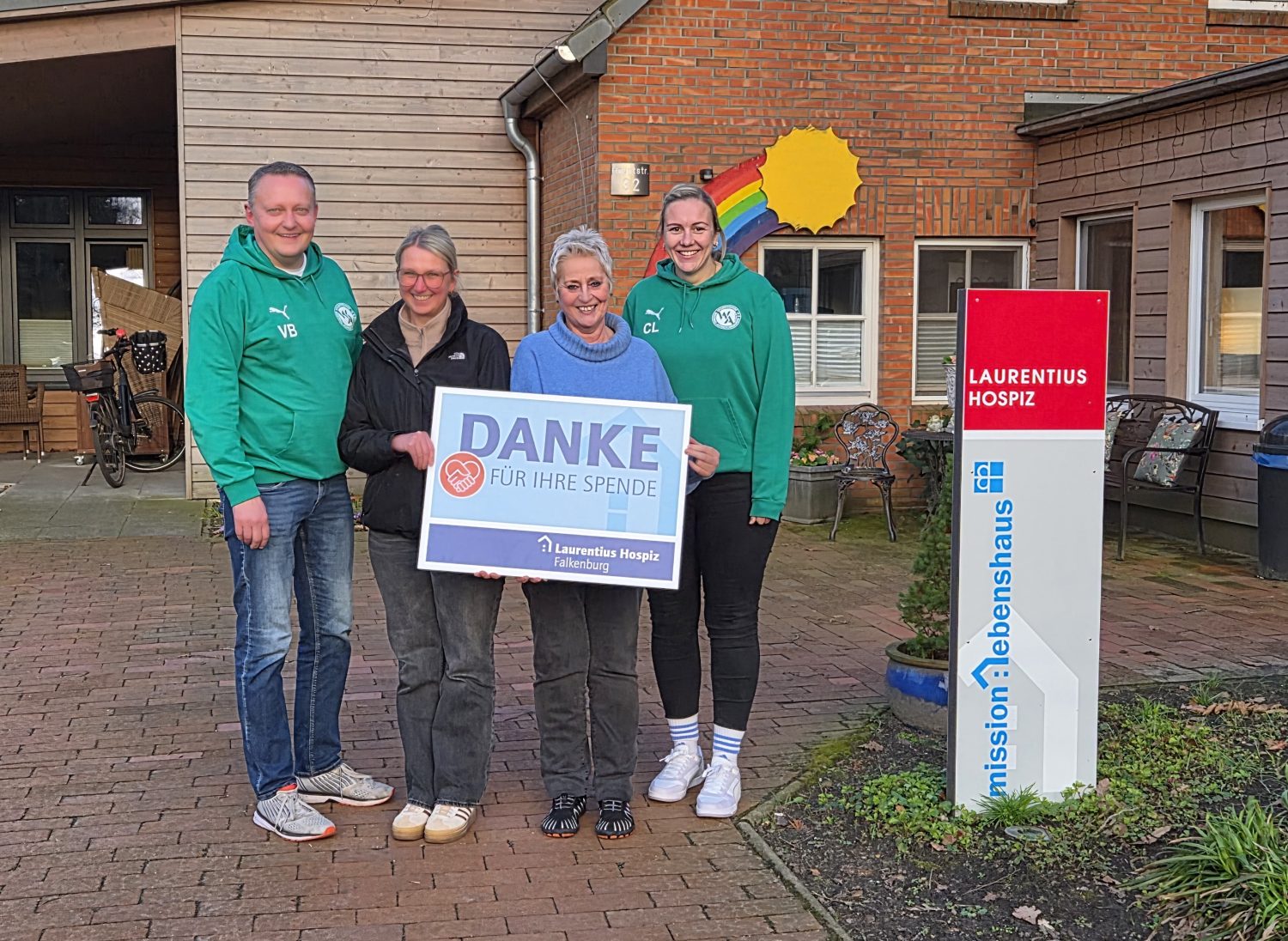 Volker Böschen und Christine Lange vom SF Wüsting-Altmoorhausen e. V. überreichten Hospizleitung Gisela Albers (2. v.r.) und Pflegefachkraft Nina Böschen den symbolischen Spendenscheck.